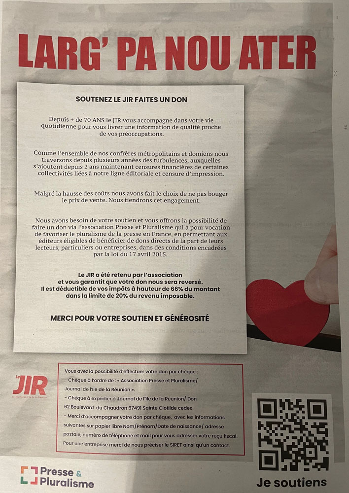 Le journal de l’île a obtenu un renvoi au 31 juillet pour sa période d’observation devant le tribunal de commerce de St Denis. Le JIR a lancé une campagne de Don sur internet.